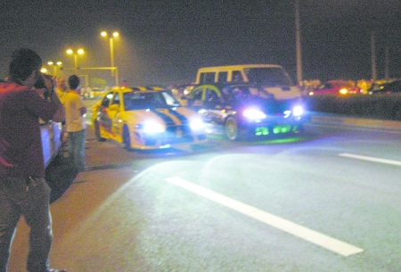 昨日上午,就有市民打進本報熱線稱,晚上10時,有人組織了18個車友會在成龍路九芝堂藥業(yè)下個口子的右邊舉行一場大型飆車活動。不過這名報料者隨后又打進電話稱活動取消了。昨晚9時40分,記者還是決定趕到現(xiàn)場一探究竟,采訪車才行駛至川師南大門時,就不停有改裝車從旁邊呼嘯而過。行駛過九芝堂藥業(yè),路邊果然停了一長串私家車。從成龍路右拐進入就是經(jīng)開區(qū)的南北干道,兩旁也停滿了各種各樣的私家車,包括206、雨燕、?怂、奧迪、奔馳等。這些車按車型停放,很多車的外觀進行了噴繪,還有很多車甚至加了渦輪增壓。一些車主下車聊天,一旁穿著時尚的辣妹十分惹眼。而附近一些居民見此陣仗,舉家老小也出來看熱鬧。幾百輛車很多都開著車燈,不時有改裝車呼嘯而過,路人的目光也隨之遠去。