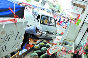 昨日下午1時(shí)30分,禪城平桂街的麗晶市場(chǎng),一輛面包車發(fā)瘋似的沖進(jìn)一個(gè)水果店,將路過此處的鄧松香老人撞飛幾米外,制衣廠女工阿玲則被碾在車下,面包車撞翻水果店,頂翻三臺(tái)冰柜,將老板娘胡金水從躺椅上撞下來。