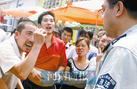 一群持信陽(yáng)口音的婦女開(kāi)始指責(zé)城管隊(duì)員:“哪有這樣的執(zhí)法人員,上來(lái)就搶東西,掀車子!薄拔覀兌际俏拿。別講大道理,我們不懂,我們掙點(diǎn)錢不容易!薄芭驳浇值览镞呑錾,哪有錢賺?”