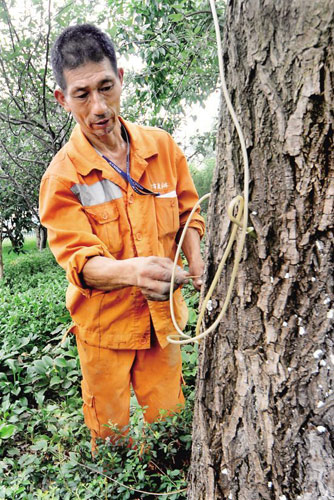 江師傅很氣憤,他說(shuō):“樹(shù)皮掉了,水分就無(wú)法輸送,樹(shù)枝就會(huì)死掉。做這件事的人實(shí)在太缺德了!”