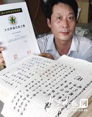 高淳縣椏溪鎮(zhèn)荊山村農(nóng)民張正福,利用6年時(shí)間反字倒抄紅樓夢(mèng)全集,共120回,86萬字,并順利獲得大世界基尼斯之最證書(如左圖)。為了給附近村民修建一條長約一千米的水泥路,他決定將這些手抄本賣給有收藏條件的愛好者。