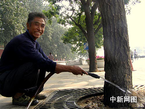 負責澆灌長安街沿路綠樹和花卉的工人侯立昌,每天從早上6點一直工作到晚上7點。“國慶人手不夠,咱們都得加班了”,61歲的侯立昌笑著告訴記者,每天澆完近60棵樹后,他都會加班參加鋪草坪、栽種花卉等工作。他說,加班從晚上11點開始,最短兩小時,最長要工作到凌晨三四點。