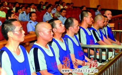 昨日,涉案15名被告人和1家被告單位在東莞中級(jí)人民法院過(guò)堂受審(如圖,蘇仕日攝)。公訴機(jī)關(guān)認(rèn)為應(yīng)以銷售偽劣產(chǎn)品罪追究其刑事責(zé)任。公訴人花了40分鐘才讀完近萬(wàn)字的起訴狀,狀中列舉了26宗假煙販賣(mài)指控。