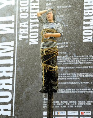 37攝氏度的高溫下,26歲的王軍被綁在近10米高的柱子上,先是被酷熱“折磨”了半小時(shí),后又被環(huán)衛(wèi)車的水龍頭沖淋了半小時(shí),耗費(fèi)了8噸自來水,總共耗時(shí)兩小時(shí)。這個(gè)名為《守望》的行為藝術(shù)作品昨天下午在黃桷坪102藝術(shù)區(qū)雷倒了不少人!