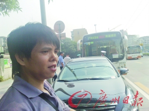 記者在上午10時許趕到事故現(xiàn)場。在先烈中路小學門前,停著一輛車牌號為“粵A 59743”的862路公交車,旁邊停著一輛簇新的天籟轎車,臨時車牌“粵AD5460”被放在駕駛臺上。據悉,這輛天籟轎車才“下地”3天。記者在現(xiàn)場看到,天籟轎車左側后門被刮傷,原本的亮黑色有五分之一被刮花,兩名司機正分別接受警察的訊問。20多歲的公交車司機嚴尚海左眼紅腫,左邊臉也腫起一塊,額頭傷口滲血,上下嘴唇均破裂流血,上衣血跡斑斑。30來歲的轎車司機鄭某則一臉茫然地站著,臉上未見傷痕,淺色上衣也沾有血跡。