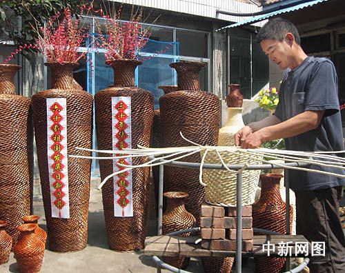 中新網(wǎng)臨沂9月10日電(記者 周秀光 通訊員 周寶云)“三十年華夏改革風(fēng)起云涌,六十載祖國發(fā)展日新月異”。走進(jìn)山東省郯城縣廟山鎮(zhèn)薛莊三村村民呂士明家的庭院,四個碩大的柳編“寶瓶”一字排開,將小小庭院擠得滿滿當(dāng)當(dāng)。指著寶瓶上的對聯(lián),“寶瓶”編織者呂士明充滿自豪的說,新中國成立六十周年,俺也得獻(xiàn)上一份賀禮。
