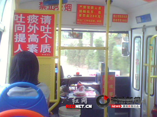 帖中附有多幅圖片,皆拍攝于公交車前門靠駕駛室的位置,在司機臺后方,有幅標語煞是顯眼,紅底,粗體白字,上面寫著:吐痰請向外吐,提高個人素質。車窗前頭有禁止吸煙,嚴禁駕駛人員觸摸錢幣等標語,還有特有的黃色鐵桿,座位,都證實這是一個標準的公交車,發(fā)帖人稱此車系江蘇宿遷的公交車。