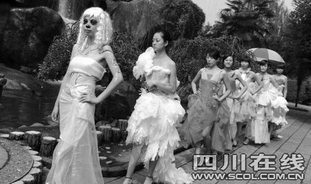 活動現(xiàn)場,七八名大學生美女志愿者身穿五顏六色,用紙袋、塑料袋、筷子和孔雀羽毛等奇異材料制成的服裝為游客們獻上了一場別出心裁的時裝秀,向每一位游客宣傳環(huán)保理念。據(jù)了解,這些紙裝是武漢一高校服裝設計專業(yè)的學生精心制作的,他們希望和成都的同學共同呼吁市民愛護環(huán)境。來自武