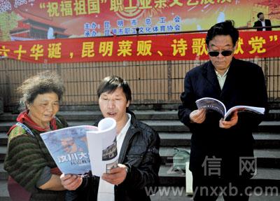 昨日上午10時(shí)30分,菜販鄧成友利用星期一買(mǎi)菜人少的時(shí)間,帶上自己親手寫(xiě)的“60華誕贊黨歌”, 在東風(fēng)廣場(chǎng)工人文化宮為群眾放聲朗誦,以表自己對(duì)黨和國(guó)家的熱愛(ài),同時(shí)也為祖國(guó)的60華誕獻(xiàn)上他最真摯的祝福。