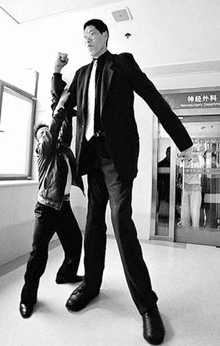 今年27歲的趙亮是濮陽南樂縣梁村鄉(xiāng)西崇町村人,身高2.46米,這一高度比姚明高20厘米、比曾有“世界第一巨人”之稱的鮑喜順還高出10厘米,是名副其實(shí)的“第一高人”。趙亮16歲時(shí)身高就已達(dá)到1.90米,17歲時(shí)被推薦到河南省體;@球隊(duì),在一次扣籃時(shí)左腳扭傷,一直未能痊愈。今年4月,天津一家醫(yī)院免費(fèi)為趙亮進(jìn)行了腳傷手術(shù)。不久,成為媒體關(guān)注焦點(diǎn)的趙亮被歐寶地板聘請,成為公司一名管理人員。上班后,趙亮作為企業(yè)形象大使備受社會(huì)關(guān)注。