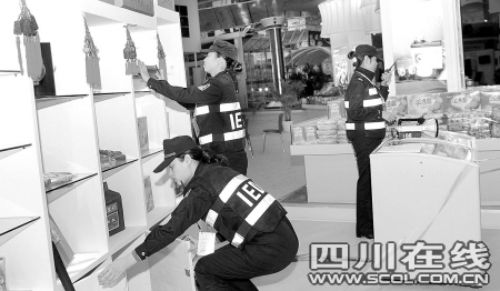 昨晚10點(diǎn),新會展中心各展館里一片忙碌。在一群正在安檢的帥氣黑衣特警中間,3個扎著發(fā)髻的女特警格外引人注目。除負(fù)責(zé)現(xiàn)場指揮的教導(dǎo)員吳虹外,28歲的羅蕾正用伸縮臂鏡檢測著一食品展臺頭頂?shù)闹,而今年剛(cè)刖闹苋,則彎腰在一排展柜前仔細(xì)檢查著。和男特警一樣,她們都穿著帥氣的黑色警服,戴著警帽,不施粉黛,右胸前印有“成都特警”4個大字的閃光背心,將她們襯得格外颯爽。