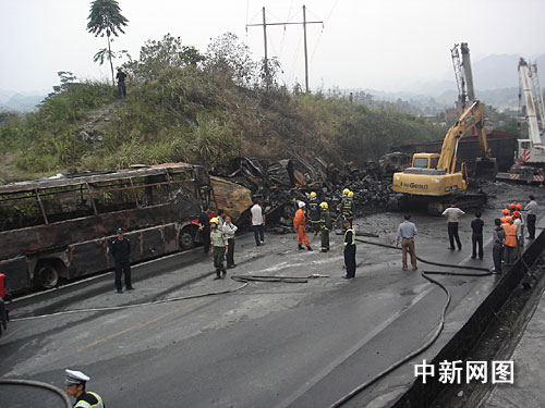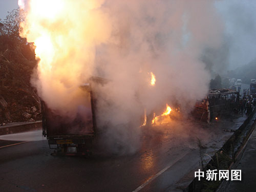 由于集裝箱上滿載約十八噸的膠水和家俱,碰撞后很快起火,大客車與運礦大貨車亦不能幸免。南丹消防官兵接警趕至?xí)r,發(fā)現(xiàn)現(xiàn)場火光沖天成了火海,其中集裝箱大卡車正猛烈燃燒,而大客車和運礦大貨車不久后也被燒成廢鐵。消防官兵隨后出動水槍滅火,四輛消防水車頻繁往返縣城運水達二十多車次。救援工作至十八日下午六時許才結(jié)束。