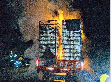 接到報警后,陽泉消防特勤中隊和平定消防中隊的20多名消防人員迅速趕赴現(xiàn)場,發(fā)現(xiàn)該車由于后部輪胎起火,車廂后半截已被濃煙包圍,受到驚嚇和炙烤的烏雞亂作一團,撲騰亂叫。消防人員立即展開行動,很快,貨車車廂內的明火被撲滅。由于該車運送的烏雞太多,空間非常密集,車廂內部的一些明火不能順利撲滅,消防人員迅速用兩支水槍從貨車上部往下打水,使水慢慢浸入到車廂內部。隨后,消防人員用開花水槍對部分被引燃的烏雞進行噴淋滅火。