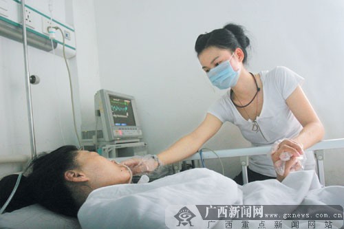 11月8日中午,記者根據(jù)帖子上所留的手機號碼聯(lián)系上了楊霏!敖憬,你睜開眼睛看看我啊,睜大一點,乖,就是這樣!”當天12時30分,在廣西醫(yī)科大一附院神經(jīng)內(nèi)科一病區(qū)7樓的病房,楊霏和剛進食完的姐姐在說話。楊霏的大姐楊耀仙躺在病床上,鼻口插著氧氣管,整個身體干瘦得只剩下皮包骨頭,神志也是迷糊不清。楊耀仙現(xiàn)在不能自行進食,只能靠親人從連接在身體上的幾條塑料管注射一些醫(yī)院配制的流體食物維持生命。而楊霏也不時拿起姐姐的手和腳做一些物理按摩。“我姐姐這兩天病情有所變重了!币姷接浾,她給姐姐蓋好被子,示意到樓梯口說話。