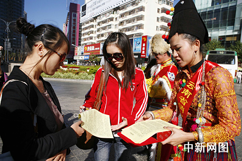 在今日舉行的宣傳活動上,記者見到了這二十六位“消防形象大使”。他們身著傳統(tǒng)民族服裝,向市民發(fā)放消防安全知識手冊,并現(xiàn)場為市民講解消防知識。據(jù)稱,他們回到自己家鄉(xiāng)后,還將繼續(xù)當(dāng)?shù)仄稹跋佬蜗蟠笫埂钡穆氊?zé),向云南少數(shù)民族地區(qū),特別是邊遠(yuǎn)的地區(qū)宣傳消防知識。