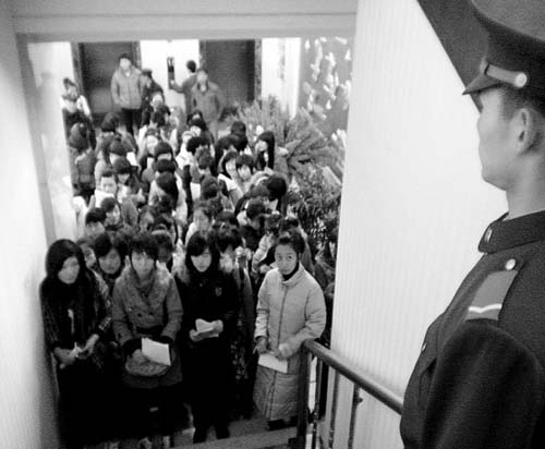 當(dāng)記者進(jìn)入鴻翔賓館一樓大廳時(shí),前來報(bào)名的女孩和家長們將這里擠得水泄不通。在賓館二樓,沈陽警備區(qū)的工作人員正在做著準(zhǔn)備工作!皥(bào)名開始后,我們將進(jìn)行分類,在校大學(xué)生將走一個(gè)門報(bào)名,應(yīng)屆畢業(yè)生將走另一個(gè)門!