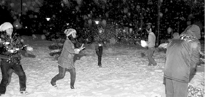 “我們?cè)夷莻(gè)戴眼鏡的,看著比較瘦弱老實(shí)!焙芸,占弱勢(shì)的“明明”形成了團(tuán)隊(duì),并制訂出作戰(zhàn)方案,選好目標(biāo)。商量好之后,四五個(gè)女生一起抱好雪球飛向一戴眼鏡的男士,而且個(gè)個(gè)都是神槍手。寂靜的綠城廣場(chǎng)也在網(wǎng)友們的歡笑聲中,變得活潑生趣起來。