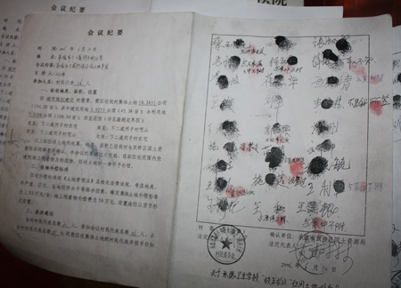 該《會(huì)議紀(jì)要》還稱:“全村村民代表總數(shù)30人,參加會(huì)議村民代表總數(shù)26人,占全村村民代表總數(shù)87%!逼浜螅凇巴庹魇占w土地的村民代表并按手印如下”之后,便有26位村民代表簽字和按的手印!稌(huì)議紀(jì)要》最后還有村委會(huì)和雙橋區(qū)國(guó)土資源局兩個(gè)部門的負(fù)責(zé)人的簽字和公章。