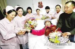 女子叫蔣翠,今年38歲。男人叫張兵,今年44歲。張兵推著妻子,輪椅軋過紅地毯,迎著空中的花瓣,進(jìn)入病房!白8D銈儯銈冏屛覀兌昧藬y手到老的承諾!贬t(yī)生護(hù)士共同祝賀夫妻倆,希望他們“新婚”快樂?粗贾贸尚路康牟》,蔣翠哭出了聲音!跋M銈兡軋(jiān)持下去,恩愛永遠(yuǎn)!蔽渚傟(duì)醫(yī)院醫(yī)務(wù)處主任向貴平擔(dān)當(dāng)起了主婚人的職務(wù),向夫妻頒發(fā)了結(jié)婚證。這張結(jié)婚證也傾注了醫(yī)院醫(yī)生護(hù)士的心血。通過和南岸區(qū)民政局聯(lián)系、溝通,婚姻登記處工作人員特地到病房,為蔣翠辦理了結(jié)婚證。