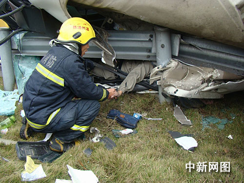 接警后,30多名消防救援人員迅速趕赴現(xiàn)場(chǎng)。10時(shí)13分許,救援人員趕到事故現(xiàn)場(chǎng)。一輛車牌為閩A25785的加長(zhǎng)大貨車撞斷高速護(hù)欄后,側(cè)翻在路邊,車頭已經(jīng)面目全非,車體嚴(yán)重扭曲變形,從車身外部清楚可見變形駕駛室與地面之間有一名男子被死死卡住,動(dòng)彈不得,臉色蒼白,另一名人員被卡在駕駛室內(nèi),生死不明,情況十分緊急。而且側(cè)翻導(dǎo)致油箱破裂,油箱里的柴油已經(jīng)流了一地,情況十分緊急,急需救援。
