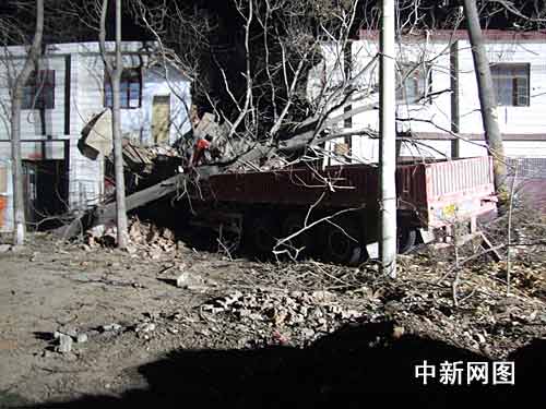 今日凌晨2時(shí)06分,河南新鄭消防部門(mén)接報(bào)后,救援人員立即趕赴現(xiàn)場(chǎng),只見(jiàn)一輛大貨車(chē)已經(jīng)深深扎入一棟掛著汽車(chē)修理店門(mén)牌的二層樓房?jī)?nèi),樓前一棵直徑約60公分的大樹(shù)被撞斷,大樹(shù)的樹(shù)身偏移樹(shù)根約有五、六米遠(yuǎn),正壓在貨車(chē)的車(chē)身上。此時(shí)的修理店已經(jīng)坍塌了一大半,大量的水泥樓板、磚頭覆蓋了貨車(chē)的車(chē)頭。