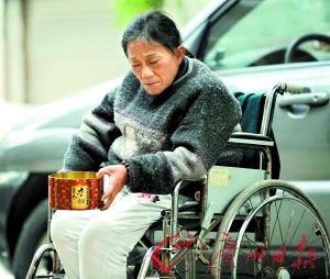 昨天早上,不到7時,周鄒就推著輪椅離開了她在人民中路露宿的地方。她說,周末六榕寺的香客會比平時多一些。很多乞丐都會“找錢”,去晚了就沒地方坐了。