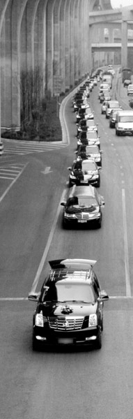 中午12點(diǎn),這個(gè)婚車(chē)隊(duì)又出現(xiàn)在了穿金路上。一輛凱迪拉克越野車(chē)排在車(chē)隊(duì)最前方,負(fù)責(zé)開(kāi)道和攝像。新郎、新娘乘坐的加長(zhǎng)林肯緊隨其后,7輛奔馳S350和1輛奔馳320行駛在車(chē)隊(duì)靠前方陣,7輛寶馬X5和3輛凱迪拉克位于車(chē)隊(duì)中間,3輛保時(shí)捷卡宴押后。這些車(chē)輛除兩輛為重慶牌照、一輛為廣州牌照外,其余車(chē)輛均掛著昆明本地車(chē)輛號(hào)牌。車(chē)內(nèi)的人不時(shí)搖下車(chē)窗,幾乎所有車(chē)輛上的司機(jī)和乘客都是年輕人,其中不乏剃著光頭的時(shí)尚潮人。