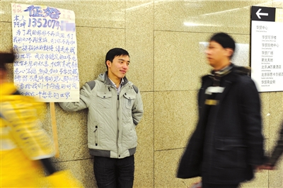 前天下午,大望路地鐵站通道里人流如織,凡經(jīng)過者或側(cè)目而視,或駐足觀讀海報,再默默離開,有人大喊了聲“夠爺們兒”,但大多數(shù)人還是表示,挺有勇氣的,但不太能理解,征到的希望應該不大。據(jù)阿坤說,整個下午只有一個中年阿姨留下了他的電話,但到截稿時,對方也沒有聯(lián)系他。(記者陳婷)