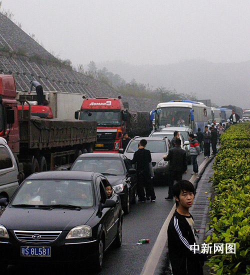 記者當(dāng)日16時(shí)30分經(jīng)京珠高速從廣州到韶關(guān),行至清遠(yuǎn)湯塘附近時(shí)發(fā)現(xiàn)交通已經(jīng)堵塞,前方北行高速路上堵滿了大大小小的車輛,一眼望不到頭,被堵的車龍長達(dá)5公里。此時(shí),雨一直下著,天氣很冷。一些已經(jīng)被堵了近2小時(shí)的乘客一邊吃著食物,一邊焦急等待著。
