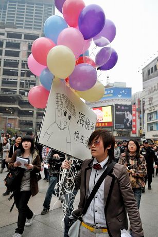 8日下午,成都春熙路中山廣場(chǎng),一名戴著墨鏡,中性打扮的女子,一手拿著氣球,一手高舉木牌“海悅哥,你在哪里?”引得路人圍觀,圍觀的人一頭霧水,并針對(duì)“海悅哥”的身份展開了豐富的猜測(cè)。想炒作自己吧?該女子酷似李宇春,中性打扮,臉型相同,就是個(gè)子比李宇春矮,可能會(huì)因?yàn)橛幸粡埫餍悄樁呒t呢!到了待嫁的年齡想給自己相親吧?……