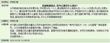 市民在公開郵箱中明確反映,春運期間,由開縣城內(nèi)往返白泉鄉(xiāng)的車票價格從平日的25元漲至50元,瘋狂漲價不知依據(jù)為何?讓人忍俊不禁的是,市物價局的回復圍繞著一條對通訊行業(yè)投訴的展開,答非所問。