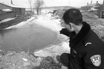 25日14時(shí)許,記者來到位于依蘭縣宏克力鎮(zhèn)東北方向的三義村,在村前路口轉(zhuǎn)彎處,記者見到一個(gè)寬約10米,長約40余米的條狀大坑,這里就是三個(gè)孩子出事的地方。此時(shí)的大坑水面上仍結(jié)著冰,但部分冰面已經(jīng)破碎,水面上還冒著熱氣。大坑周圍已經(jīng)圍上了繩索,一塊木板警示牌上面寫著“此處水深危險(xiǎn)”,紅色的油漆還沒有干。附近的居民告訴記者,這塊木牌和攔坑的繩索都是今天早晨才設(shè)立的。