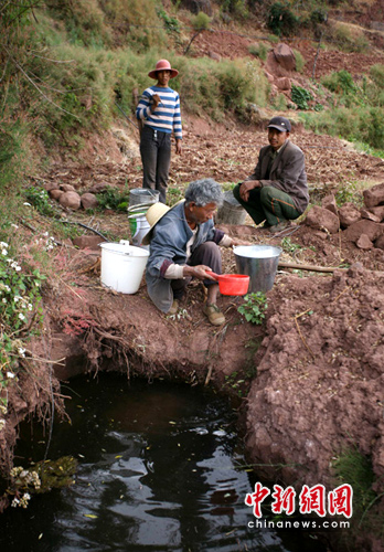 “1月18日,寨子里的井就徹底干了,200多人的飲用水告急。第二天,村民們在那塊低洼地挖了一個長1米左右,寬40公分的水洼,勉強能夠在那打水。”起榮峰不停地給記者比劃當時的情況。之后,上灣村寨的村民就靠這一個小水洼暫時解決了生活用水。村民張春富說:“那點水根本不夠我們吃,每一家都是隔天挑水,而且還得分上午、下午輪著挑,那里還有水分來澆地的莊稼哦。”