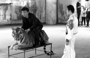 這時,在臺上站著4名穿著工作服的男性工作人員,其中1人負(fù)責(zé)拍照,其他3人看守老虎,此外還有一名女性工作人員在邊上幫忙吆喝并收取每次30元的合影費。