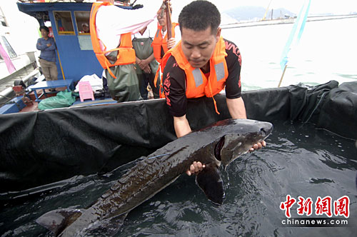 中新社廈門4月22日電 (記者 陳悅)22日下午,廈門在九龍江雞嶼海域放流108尾有“魚類活化石”之稱的中華鱘。其中四只在海洋公園保育基金贊助下,首度配上“衛(wèi)星追蹤信標(biāo)”,相關(guān)專家表示,這將是中華鱘研究及保育的一大突破,將開展有效保育中華鱘新的一頁。