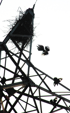 “一個原本是喜鵲筑好的窩,卻引來‘同行’八哥的爭奪,喜鵲、八哥兩路人馬一共四只鳥展開了爭奪,戰(zhàn)爭持續(xù)了10來天,到現(xiàn)在也沒有結(jié)果!弊蛱焐衔,家住南京下關(guān)水關(guān)橋附近的居民武先生向記者報(bào)料,并講述了發(fā)生在他家附近一座電線架上的一幕幕“鳥類戰(zhàn)爭”場景。