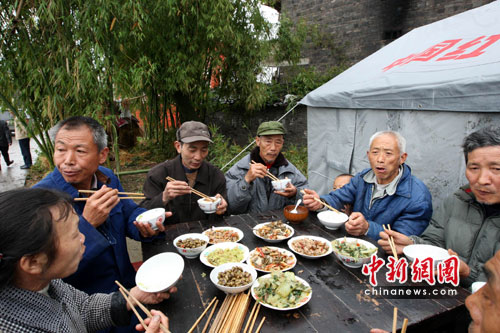 7日中午,記者在重慶墊江縣沙坪鎮(zhèn)李白村一災(zāi)民安置點看到,8名受災(zāi)群眾正吃著熱氣騰騰的飯菜!白约曳课菰5日晚被風(fēng)暴雨吹跨后,今天是在災(zāi)后第一次吃上了熱飯菜!币秽嵭沾迕窀嬖V記者,除能吃上熱騰騰的飯菜外,他們的安置帳篷也已搭建完畢。