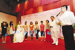 當(dāng)舞臺背景展開“杰出男生11大優(yōu)點(diǎn)”的投影掛屏?xí)r,主持人問女嘉賓喜不喜歡這些優(yōu)點(diǎn)?她們齊聲道:“喜歡!”主持人說:“這就是站在我們面前的這位帥哥身上所具備的優(yōu)點(diǎn)!边@時,主持人問新郎:“什么是最好的男女組合?”新郎答:“男生智慧,女生賢惠!”“請你選出‘心動女生’!”這位新郎臉現(xiàn)真誠,大步走到舉著“賢惠”寫字板、風(fēng)姿綽約的新娘面前,牽住她的手,兩人一起走向臺前,對著來賓大聲說出“愛的誓言”,全場掌聲響起。