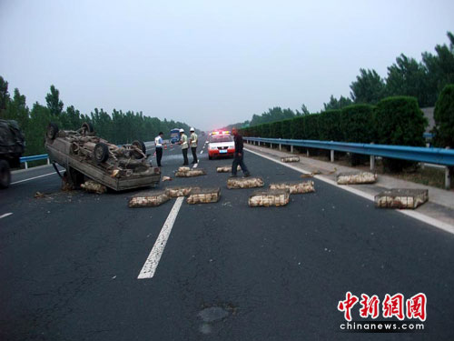2010年6月22日中午13時許,炙熱的太陽照得大地只想冒煙,一輛白色小貨車滿載雞子疾馳在京港澳高速公路上。當行駛到京港澳高速632公里西半幅時,突然“咚”一聲響,坐在駕駛位上的李某突然感覺車輛傾倒,控制不住疾馳的貨車,車輛側(cè)翻在高速公路上,滿車的雞子撒在路上,到處都是雞毛。河南高速交警總隊黃河二橋大隊接到過路司機的報警后,迅速趕到事故現(xiàn)場,設置警戒帶,迅速搶救傷員,所幸駕駛員李某事先行車時扎緊了安全帶,只是受了皮外傷,在急救人員救出時依然茫然不知所措。在民警、路政工作人員的共同努力下,迅速清理現(xiàn)場,恢復路面正常通行。