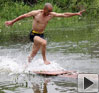 獨(dú)竹漂又被稱為“水上芭蕾”。記者在表演現(xiàn)場(chǎng)看到,隊(duì)員將長(zhǎng)7.5米,寬15厘米的的獨(dú)舟放入水中,然后腳踩獨(dú)舟,手執(zhí)4.5米的劃桿,悠閑地在湖面上做起了各種高難度動(dòng)作:一會(huì)兒隊(duì)員們做著俯臥撐、一會(huì)兒又表演金雞獨(dú)立和隊(duì)列變換,引來(lái)岸邊觀眾的不斷喝彩。(表演隊(duì)員):人在江湖漂,哪能不挨刀,為啥不挨刀,咱會(huì)獨(dú)竹漂….