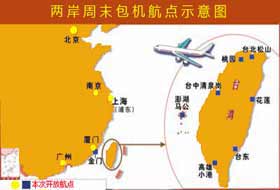 航點(diǎn) 大陸方面同意先行開(kāi)放北京、上海(浦東)、廣州、廈門(mén)、南京5個(gè)航點(diǎn),并陸續(xù)開(kāi)放成都、重慶、杭州、大連、桂林、深圳,以及其他有市場(chǎng)需求的航點(diǎn)。臺(tái)灣方面同意開(kāi)放桃園、高雄小港、臺(tái)中清泉崗、臺(tái)北松山、澎湖馬公、花蓮、金門(mén)、臺(tái)東等8個(gè)航點(diǎn)。