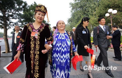 圖:少數(shù)民族代表手持五星紅旗步入慶典現(xiàn)場(chǎng)