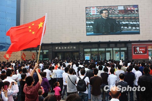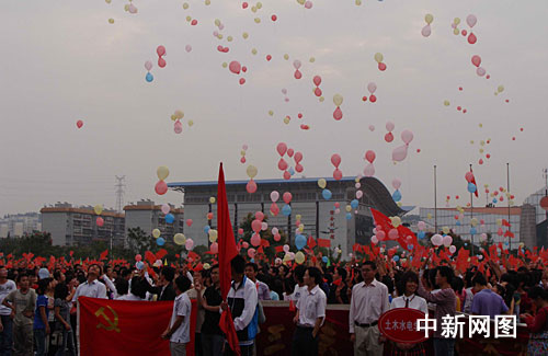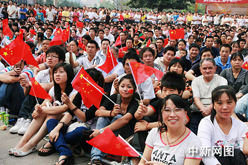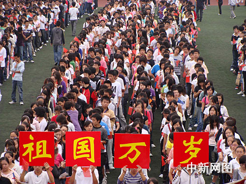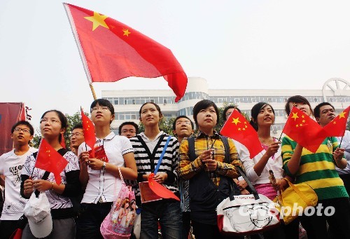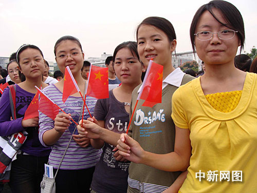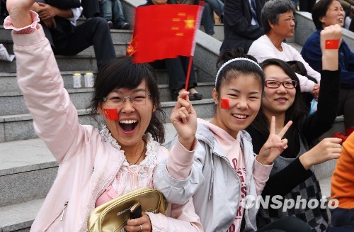 圖:黑龍江大學(xué)生揮舞國旗為祖國歡呼