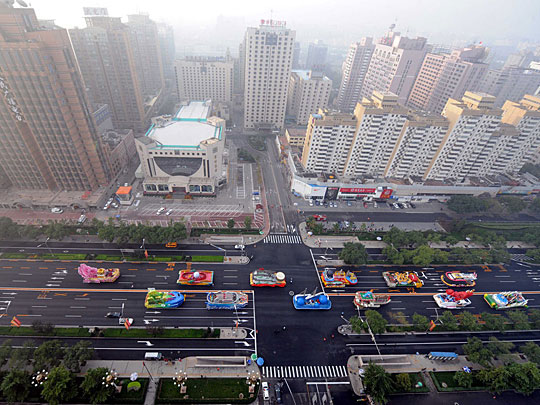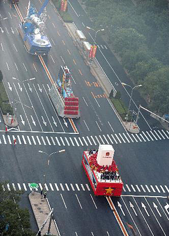 圖:國慶游行彩車向指定地點(diǎn)集結(jié)