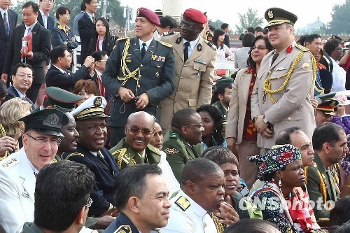 外國武官云集觀禮臺(tái) 準(zhǔn)備觀看閱兵儀式