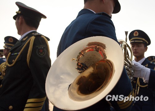 圖:國慶盛典前軍樂隊(duì)號(hào)手認(rèn)真準(zhǔn)備