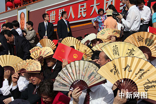 圖:天安門朗日當(dāng)頭照 觀禮臺(tái)嘉賓忙遮陽