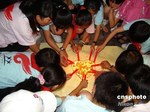 四川災區(qū)孩子用紅色燭油作心型字寄相思