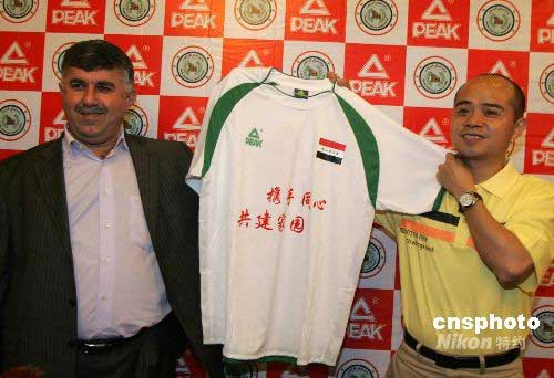 圖:伊拉克隊著“愛心球衣”聲援中國災區(qū)