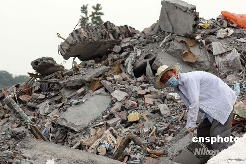 圖:幸存者在向娥中學(xué)廢墟中尋找遺物